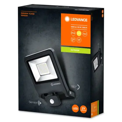 Descrizione Ledvance Proiettore LED Endura Nero 50W 4500lm 100D - 830 Luce Calda | IP44 - Sensore di movimento e luce - Simmetrico