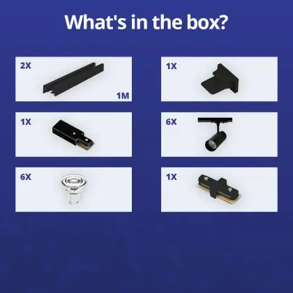 Descrizione Set completo 1-Fase Rail 2 Metro Nero | incl. 6x Faretti + GU10 2700K 3W Dimmerabile + Tappo Di Chiusura, Connettore di Alimentazione e I-Connettore